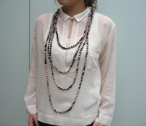 とても長い一連ネックレスなので、巻く幅を変えれば、重ねて付けているような雰囲気にも。