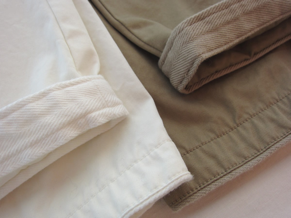 このパンツの最大のポイントは、裾をロールアップしたときに、本体と同色のヘリンボーンテープがちらっとお目見えするデザイン。さりげないけど心くすぐられる演出です。もちろん、ロールアップせずにそのまま穿いても大丈夫です!