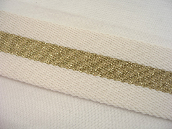真ん中にラメのラインが入ったこのリボンベルトは、メーカーさん一押しの一本です。雑誌などにも取り上げられたりと大ブレイクしたベルトだそうです。白ベースにゴールドがカジュアルな中にも上品さがあり、その上何にでも合わせられるという優れものです。
