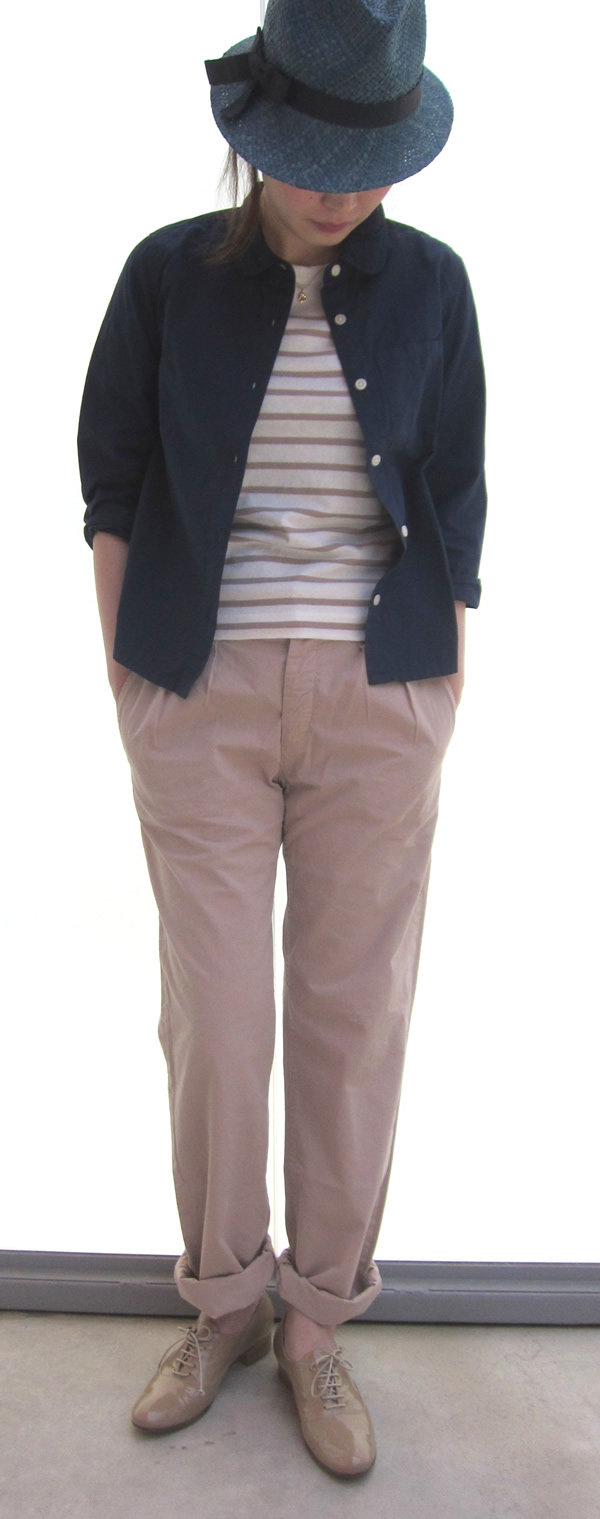 ・シャツ ¥10,500 ・インナーカットソー ¥9,975 共に「MARGARET HOWELL」