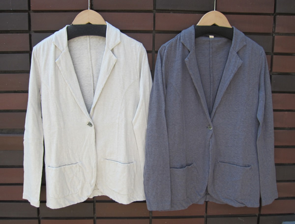 〈右〉柔らかな天竺素材で作った、1つ釦のテーラードジャケットです。
