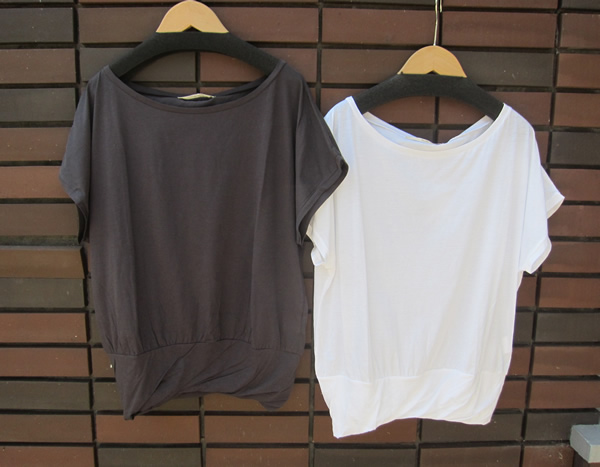 〈右〉細く繊細な糸で編んだ、ジャージ素材のドルマンスリーブのカットソーです。