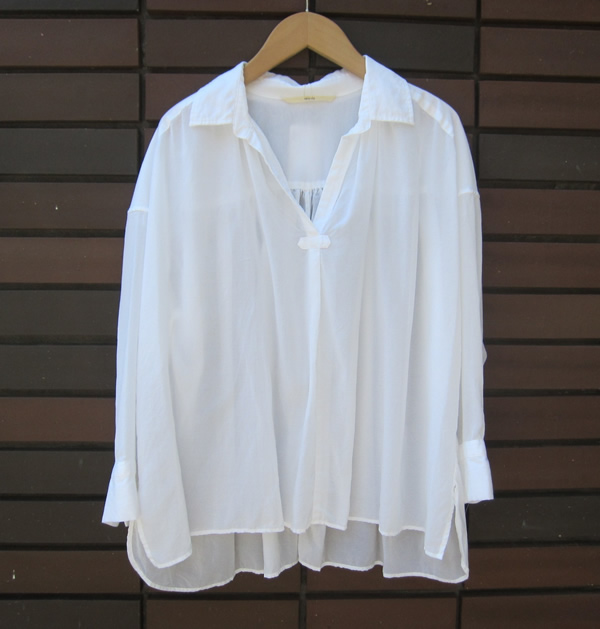 〈右〉後ろにギャザーが入っており、横広なエアリーなシャツです。