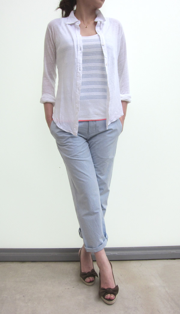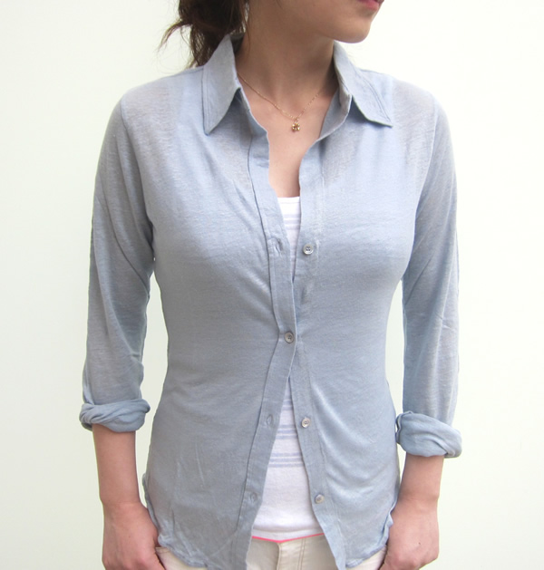 襟付きの前開きカーディガンも、しゃりっとした着心地で、夏まで快適に過ごしていただける羽織りものです。落ち感のある素材ですので、袖口も軽くロールアップして自然な感じで着ていただくのが、大人の抜け感があって素敵です。