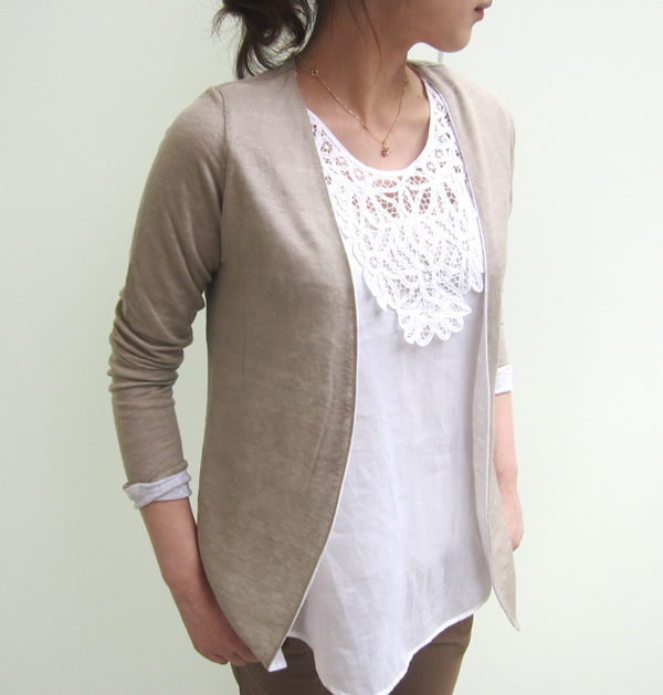 釦のない少し長めのカーディガンですので、パンツスタイルに好相性のカーディガンです。さらっとした着心地は、肌にまとわり付かず、ちょっとした羽織りものとしても日焼け対策としても重宝します。