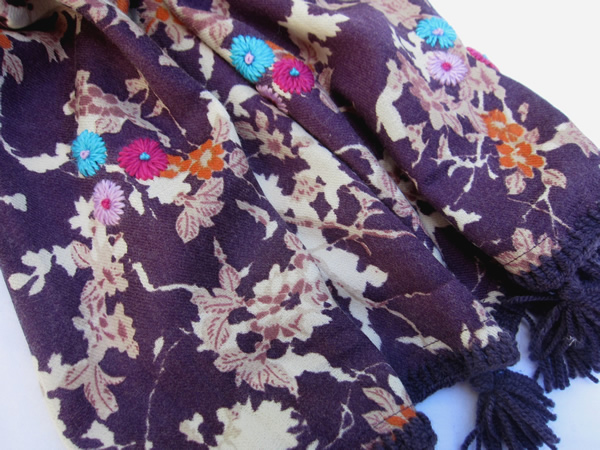 こちらは、パープルの地に花柄が描かれています。首に巻いた時、端に施された刺繍がチラリと見えてアルテアらしい一枚です。