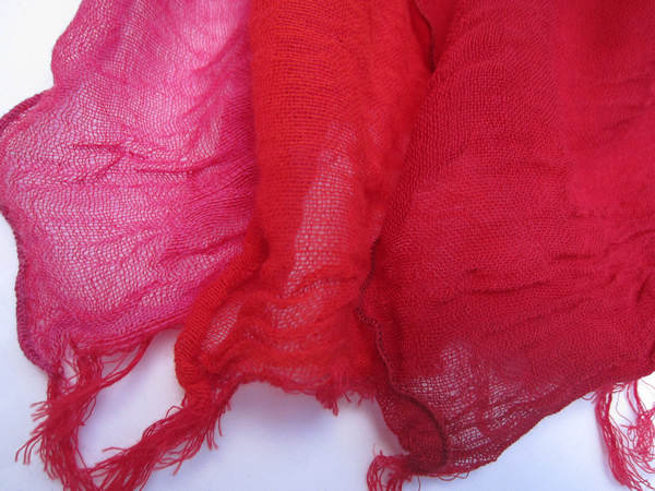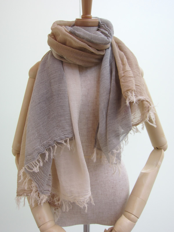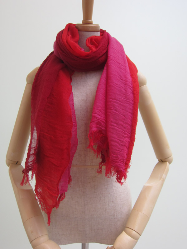 こちらは、圧縮させてシワ感を出した肌触りのいいストールです。ぐるっと巻くだけで色々なカラーが顔をだしニュアンスを変えられる一枚です。