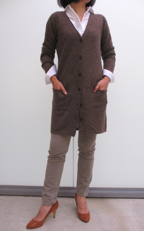 こちらは、ロングカーディガン。ふんわりとしたウールモヘアニットは、とても軽く着用感を感じないほど。ロング丈のIラインは、細身のシルエットなので、パンツやスカート、ワンピースにもすっきりとバランス良くまとまります。レギンスを合わせて、ボタンを全て留めればワンピース風にも着こなしができる一枚です。