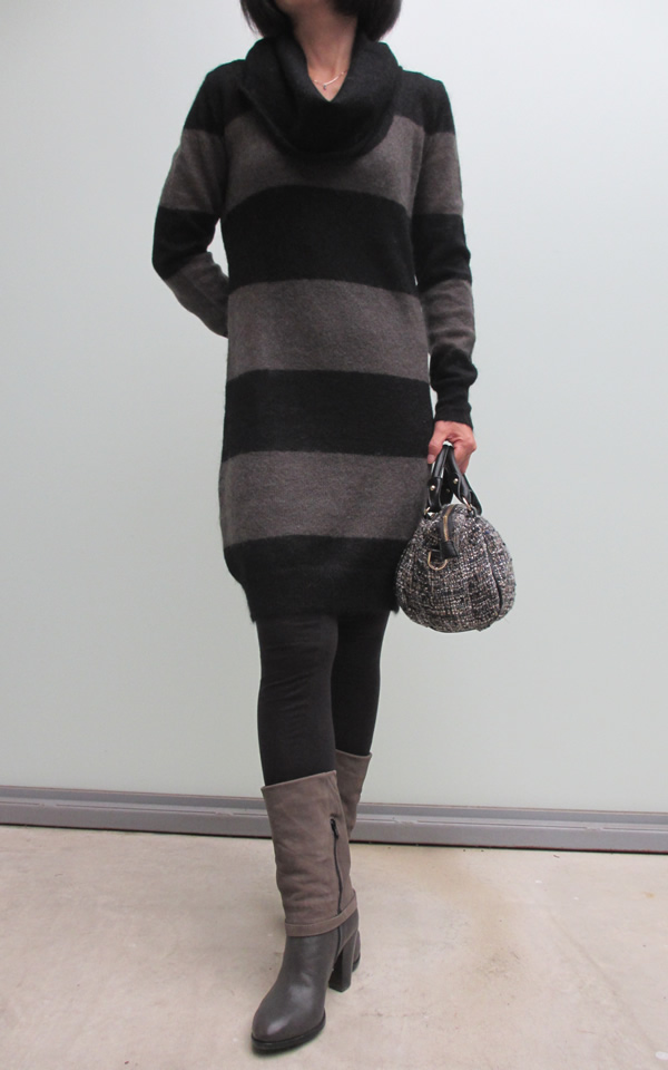 色は、1色のみです。黒とグレーの太ボーダーのコントラストにオフタートルが大人っぽいですね。