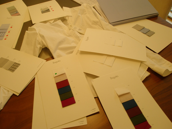インポートはこんな感じで、セレクトしています。型を選んで、それに載せることのできる生地を選びます。生地は、小さいので、製品になったシャツをイメージしなければいけません。慣れないと、なかなか決めることができません。この日も、ずいぶんと時間をかけていましたね。