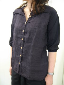 リネンジャガードがナチュラルな雰囲気を出しています。前身頃がリネン素材で、背中と袖の部分がカットソー素材になっているので動きやすく、普段にガンガン着まわせるアイテムです。また、木のボタンがアクセント。