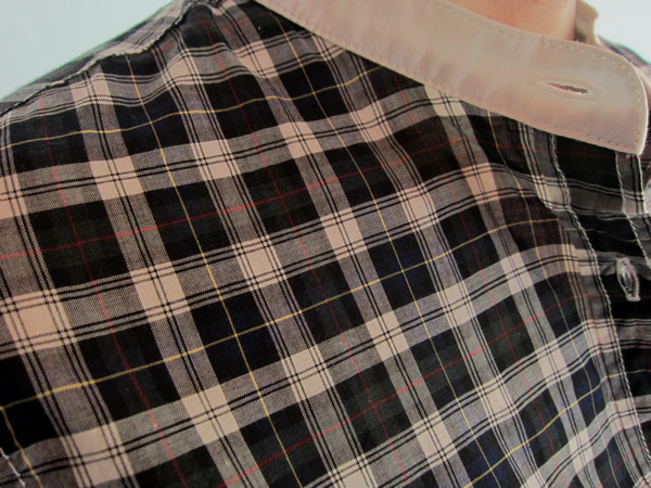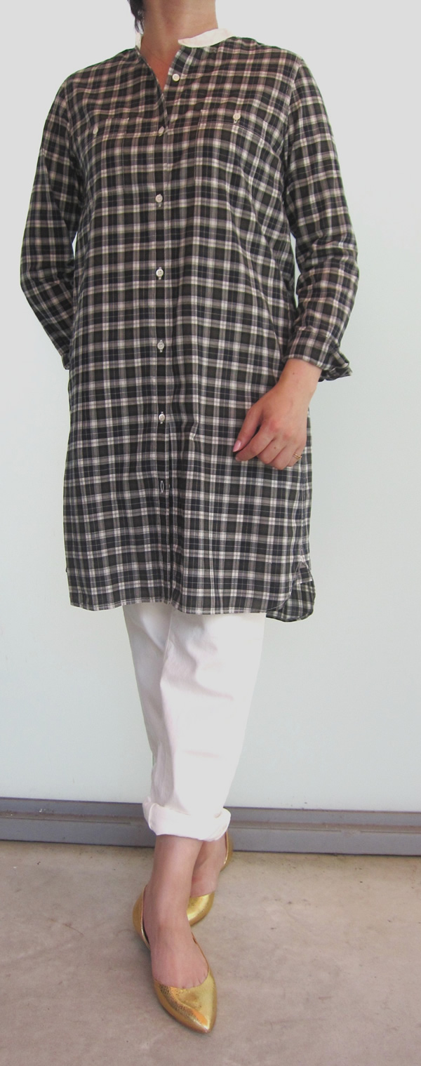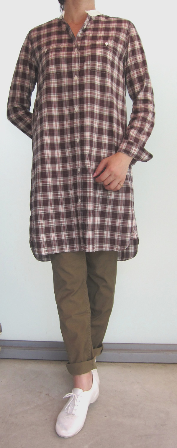 ワンピースは、クレリックのバンドカラーに仕立て、トラッド感を演出しています。もちろんワンピースとしても着ていただけますが、今回はパンツと合わせて。展示会では、ブーツとコーディネートしていましたが、その着こなしはもう少し先になりそうです。
