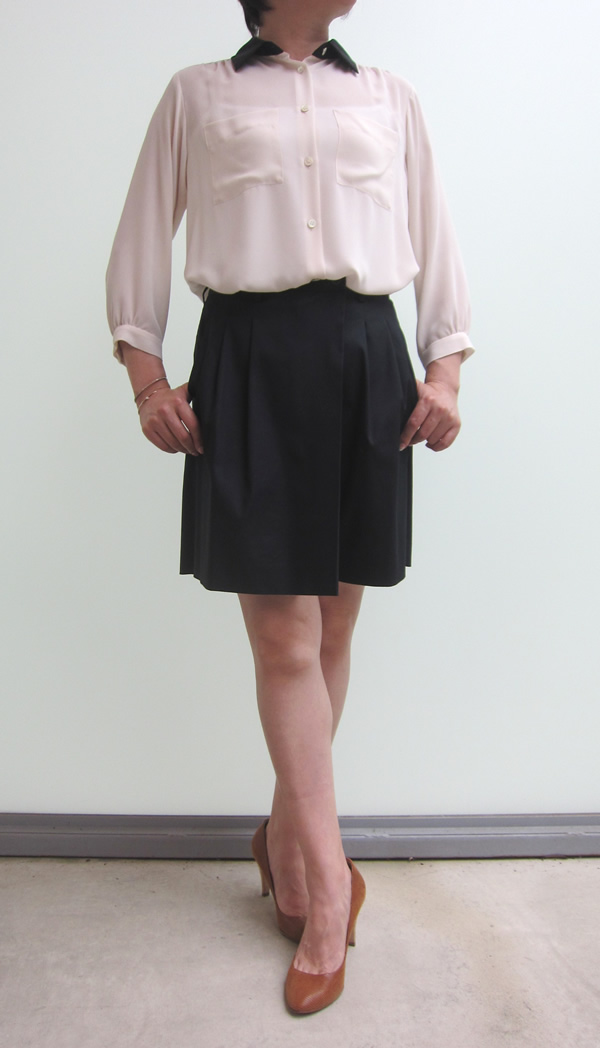 一見すると、巻きスカートのようなデザインですが、ショートパンツです。タックの入った裾に向かって広がるシルエットですので、脚をすっきりと見せてくれ、秋になったらブーツともバランスの取りやすい丈になっています。写真では分かりにくいですが、濃紺です。