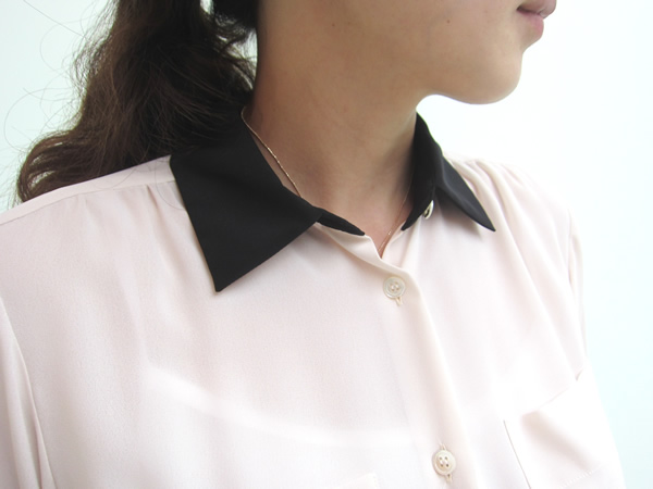 衿は、異素材&配色使いのクレリックタイプで、シンプルながらもエッジの効いたデザインです。この配色使いには、顔周りを引き締めてくれる効果も期待できます。