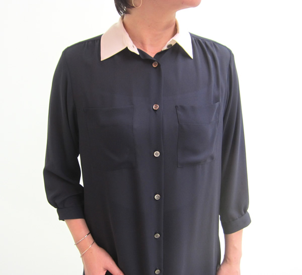 ほのかな透け感と落ち感が、エアリーな雰囲気漂う上品なシャツは、クラシックでありながら、大きな両胸ポケットなど、マニッシュな一面も。シルクのような艶は、女性らしさをぐっと引き上げてくれます。着丈が長めですので、タックインやウエストマークがお勧めです。