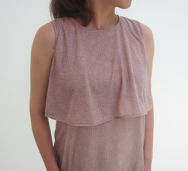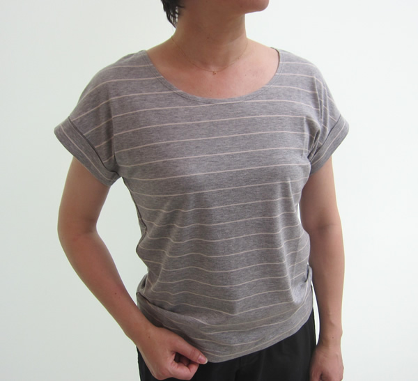 カットソーに生地に、メリヤス編みがプリントされた面白いデザインですが、着ると大人っぽい雰囲気に。一枚で着ても素敵ですが、ジャケットのインナーとしても活躍します。上半分が二枚重ねになっていて、被ったような雰囲気で、落ち感がとても綺麗です。今回は、メリハリコーディネートでしたのでインしましたが、ショートパンツや細身のパンツでそのまま着てもバランスはgood。