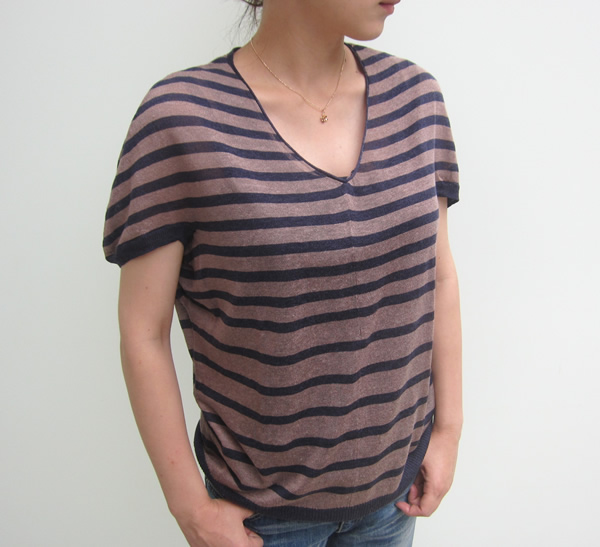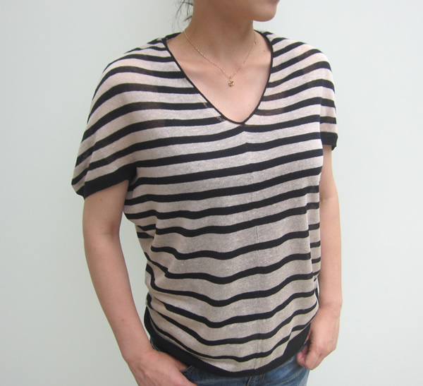 ボーダーが繋がっているので身頃と袖が一体化したようなデザインは、袖が後ろから被さるような面白いデザイン。また、ボーダーの間隔が、上から下に向けて太くなっていくので、お腹周りをすっきりと見せてくれます。さらに、鎖骨が美しく見えるVネックは、着やせ効果も期待できます。