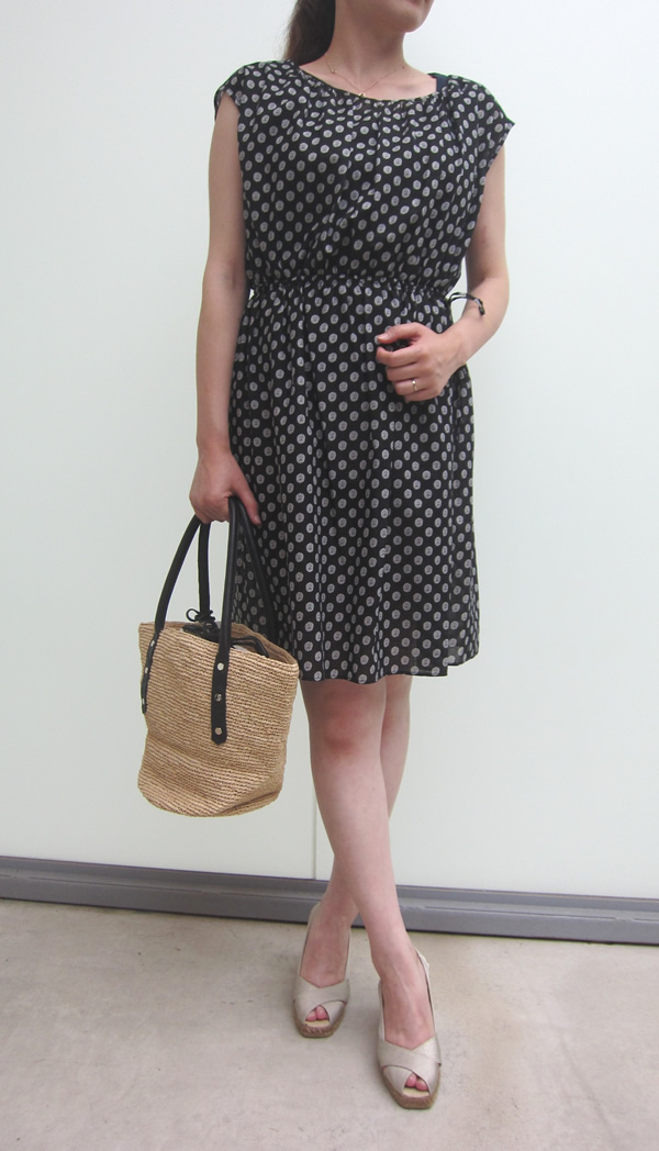 ギャザー使いのワンピースは、ウエストをぎゅっと絞って着ると素敵な、フレンチシックな一枚です。サンダルやカゴバッグなリゾート感のある小物と好相性。