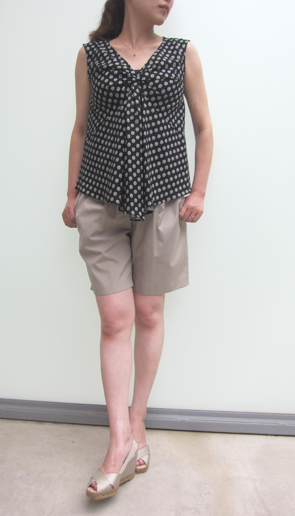 膝が思いっきり見える長さですが、上品に見えるのはフロントにタックが入っていて、ゆったりとしたシルエットだからです。太ももよりも裾の幅が広いほど、脚は細く見えるという効果は抜群です。