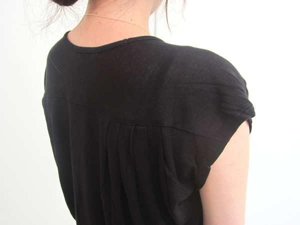 肩と背中に施されたプリーツから流れ落ちるようなドレープがエレガントです。大胆に開いた深めのVネックやドロップショルダーなど、さりげないデザインがお洒落です。