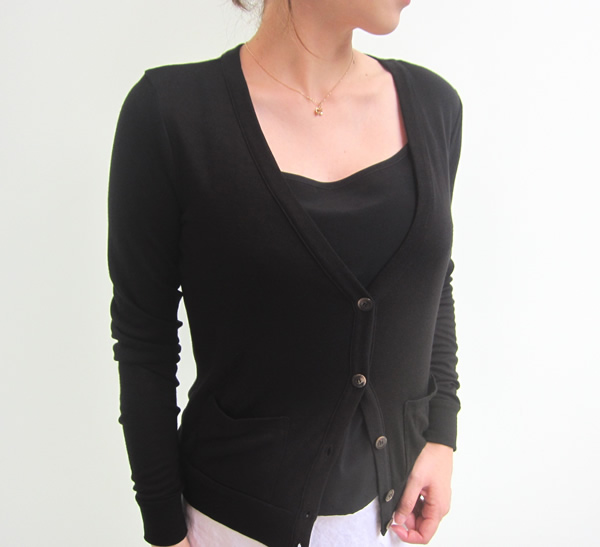 同素材を使った長袖カーディガン。伸縮性があるので、フィットしながらもすっきりとシルエットは、さすがです。深く開いたVネックもすっきりと見え、開けて羽織った時にもだらしなく見えません。