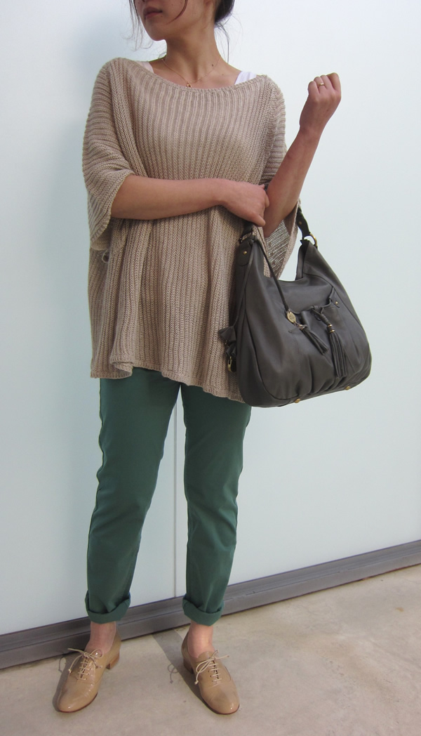 程よい感じに力の抜けたカジュアルスタイルは、トレンドのカラーパンツで、シャープな印象のグレーのバッグでスパイスを。カラーパンツもヌーディなカラーと組み合わせたり、女性らしい落ち感のあるアイテムと合わせると、ぐっと大人っぽく、マニッシュな雰囲気に仕上がります。