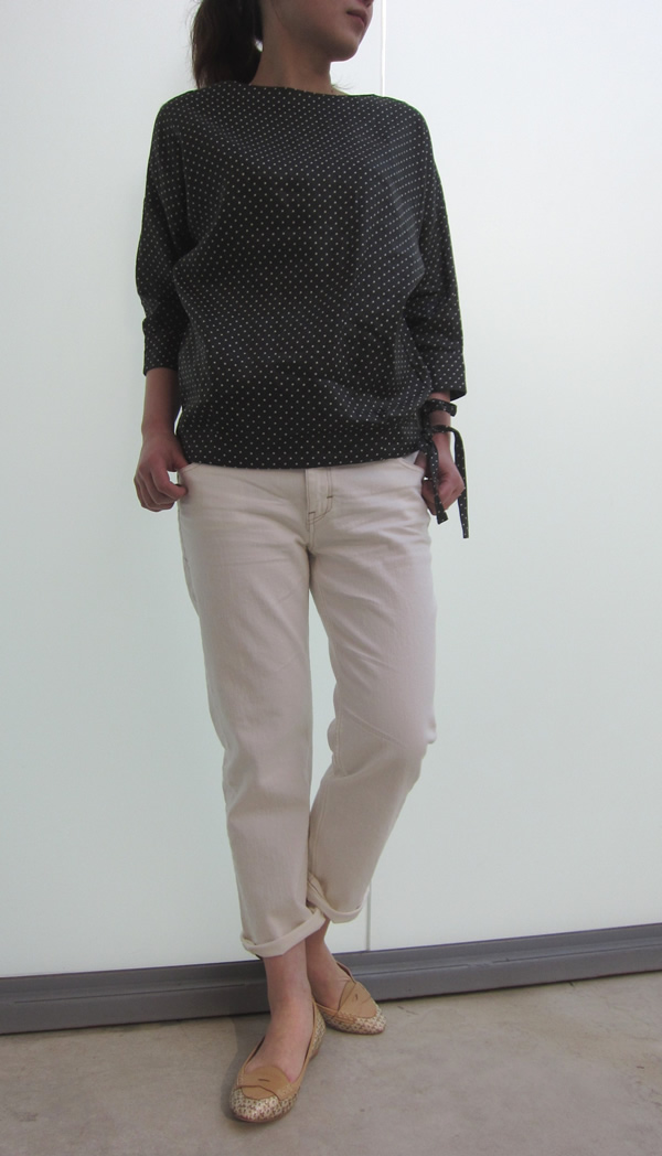ビッグシルエットのシャツは、細かなドットなので、カジュアルになり過ぎず、上品に着ることができます。