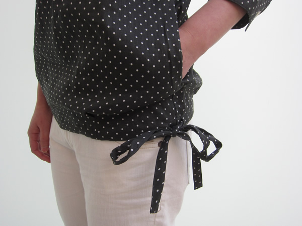 色違いのグレーを着たこちらは、腰のリボンが特徴のブラウスです。