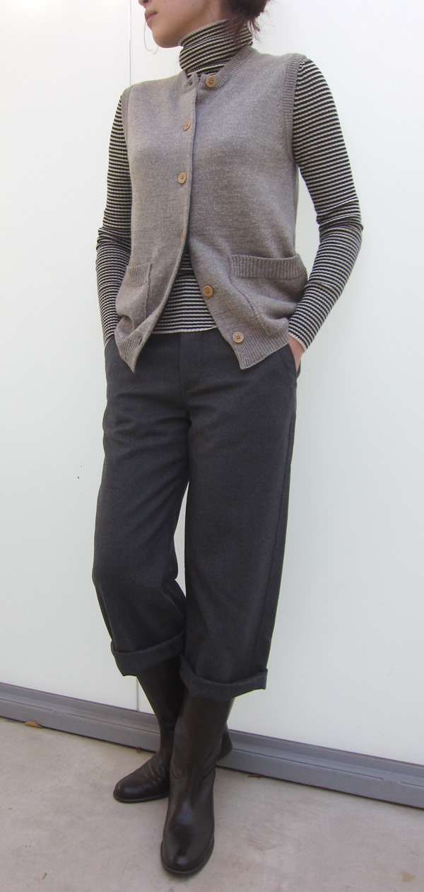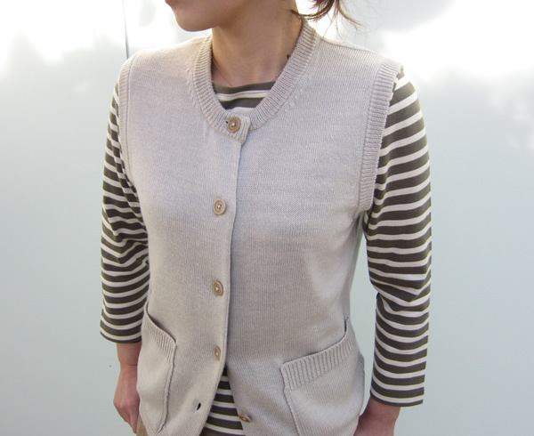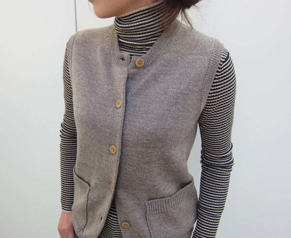 ウールとコットンを撚糸した柔らかくしなやかな風合いのベストです。少し丈が長めなのでワンピースの上に羽織ったりするのも素敵ですし、すっきりとした印象に仕上げてくれます。