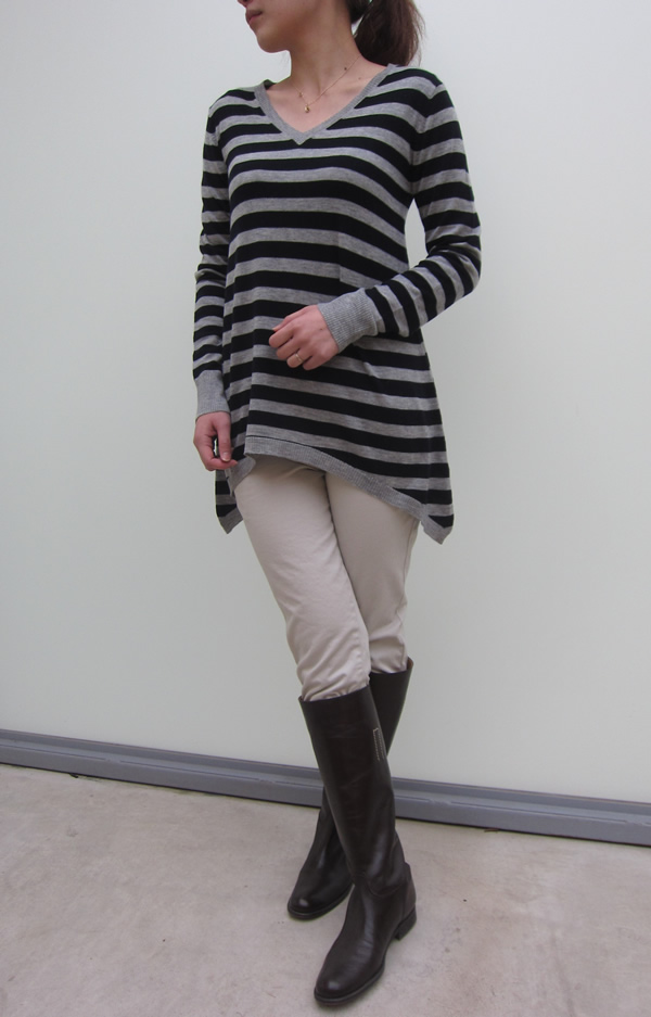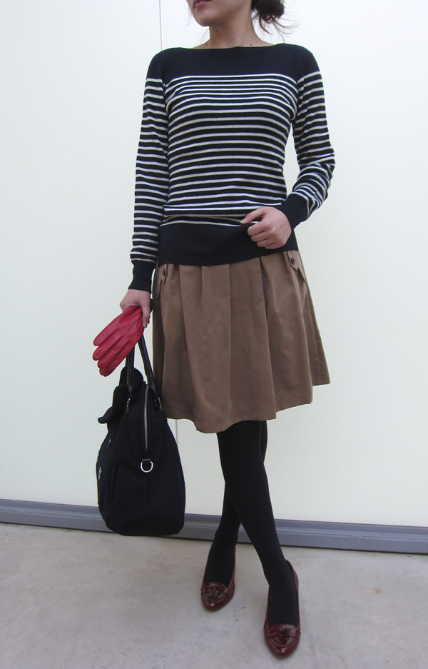 意外にもこういうシンプルなボーダーニットを展開していなかったので、すごく新鮮な雰囲気で着ることができました。ブーツを合わせてもいいですが、あえてパンプスをもってこれば、ボーダーだって女性らしい上品なコーディネートが楽しめます。
