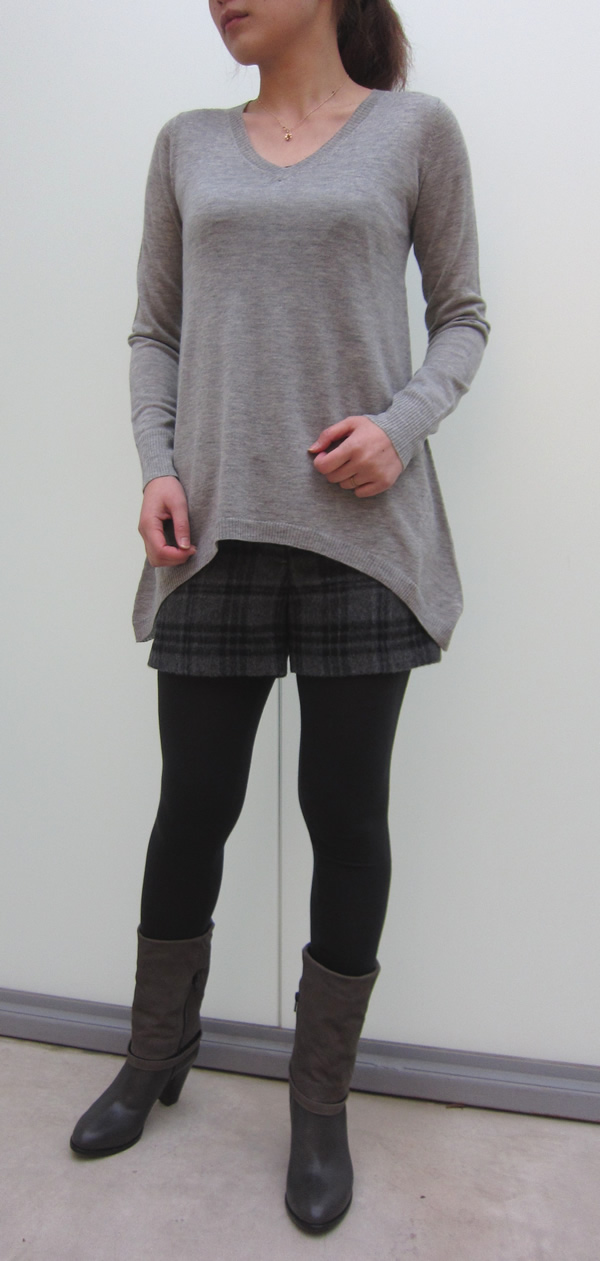 上のボーダーの無地バージョンです。定番ともいえるグレーに、この時期ちょっと着てみたいホワイトの2色展開です。それに合わせたのは、ショートパンツ。こういう丈のニットには、コンパクトなボトムがよく合います。(*メーカーさんからのご好意で、この他にもショートパンツを中心にボトムをフォローしていただきました。ぜひ店頭でご覧ください。)