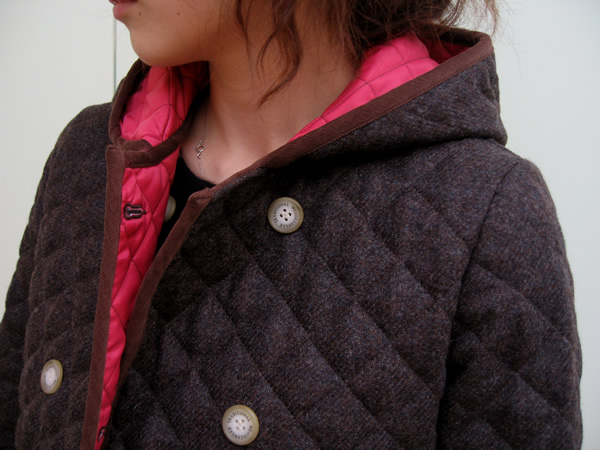 ウールツイードで、雰囲気のある素材感で、フードからちらっと覗く裏地のピンクが可愛らしいですね。