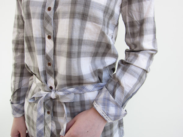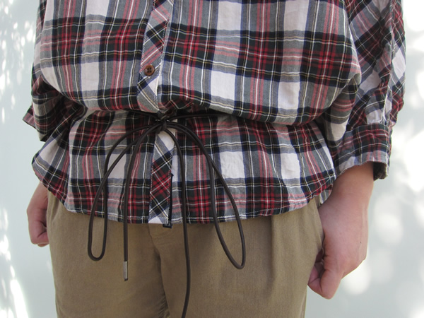 こちらは丈が長くすっきりとしたデザインのシャツ。紐が付いているので、少しブラウジングして着ていただくと素敵です。