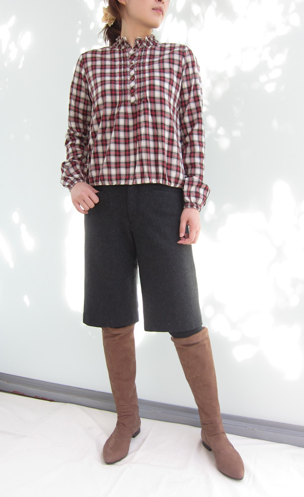 首元のフリルとタック使いが可愛らしいコンパクトなシャツは、マニッシュながらも、女性らしさを忘れない、そんなシャツに仕上がっています。袖口と裾にはゴムが入っているので、程よくふんわりとしたシルエットです。