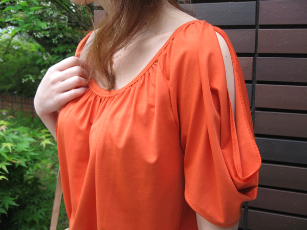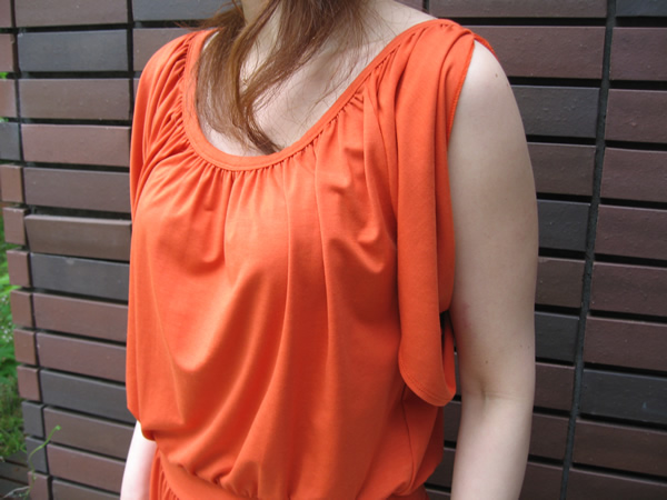 フロントにはドレープを取って胸元をセクシーに。全体的にボリュームがありますが、それが逆にすっきりと見せてくれます。バックスタイルも可愛らしさを忘れません。Tシャツ感覚で着られる、一枚でサマになるトップスですね。