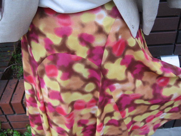 ぼかし風の柄が、キャッチーなプリント素材で作ったスカートです。