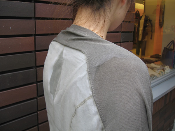 実は、前身頃はニットなんですが、後身頃がシルクシフォン使いになっています。さりげなく透け感を取り入れるのが◎。あえてカジュアルなコーディネートに、大人っぽさのあるアイテムを組み合わせるのが、いいですよね。