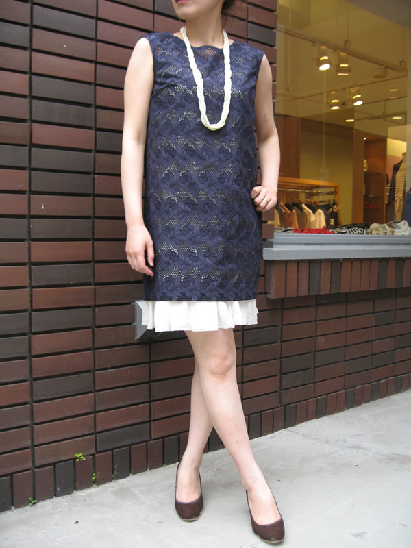 こちらは、レースの透け感が上品なワンピース。フラワーボーダーのようなカットワークレースが全身に散りばめられています。Iラインですっきりとしたシルエットに、裾にランダムタックをたっぷりとった白のラミーのペチワンピース付きです。