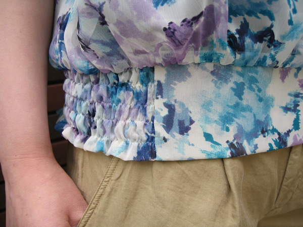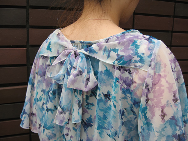 色使いも素材感も、涼しげなシフォンブラウス。ブルーとパープルの配色がとてもおしゃれ。