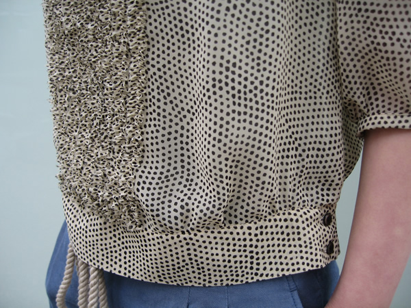 裾の切り替えやサイドの釦もアクセントに。ドットも細かく手で描いたようないびつさが、甘さを抑えてくれます。色違いはブラックにベージュのドットです。