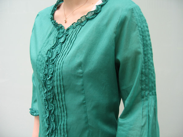 センターにはタックが、襟元と袖口にはアコーディオンフリルが施してあり、すっきりと見えながらも、ディテールにこだわった一枚です。