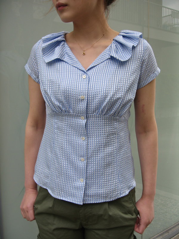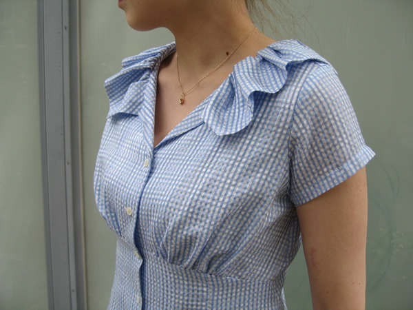 シルクコットンのドビー素材の上にプリントでギンガムチェックをのせたブラウスです。動きのある襟がコーディネートのポイントに。