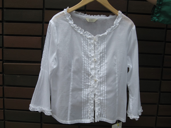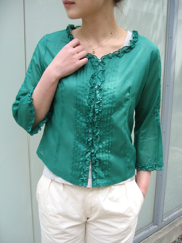 前開きでカーディガン感覚でも切られるフリルブラウス。丈短なので、スカートにもすっきりと合わせられます。