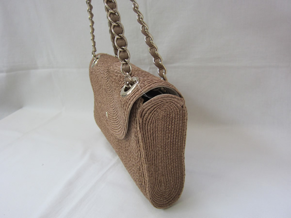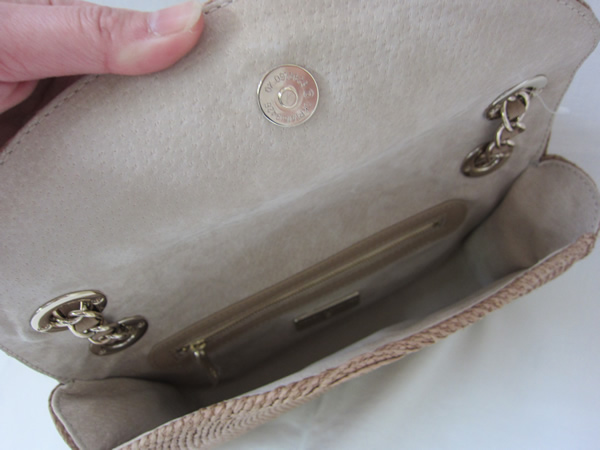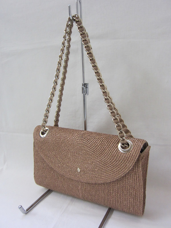 革とチェーンのハンドルがポイントの手編みラフィアのクラッチバッグです。ハンドルは、写真のように二本で持つこともできますし、一本だけ引っ張ればハンドルが長くなり、一重でも二重でもお好きな持ち方で合わせていただけます。マグネットで開閉し、内側はなんと、スエード張り。小さなポケットがひとつ付いています。