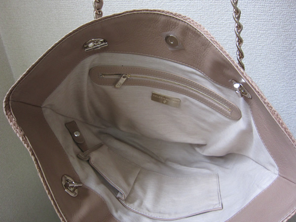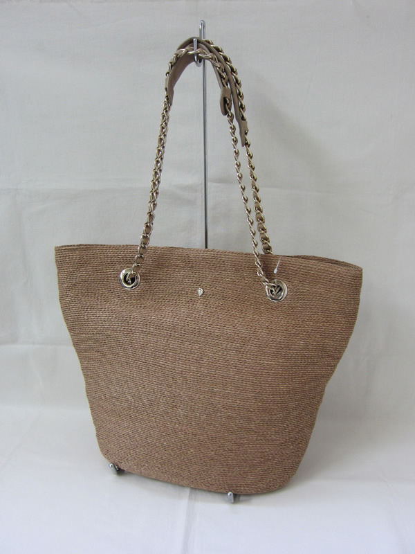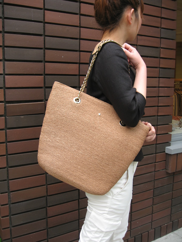 ソフトな感触が心地よい、手編みのラフィアブレードのトートバッグです。革とチェーンのハンドルが高級感たっぷりです。カゴ=カジュアルを覆すような、きれいめスタイルにも対応できる、大人トートです。マチも薄く、すっきりとしたデザインで、内側はコットンの裏地付き。サイドにポケットがあり、開閉もマグネットが付いているので安心です。
