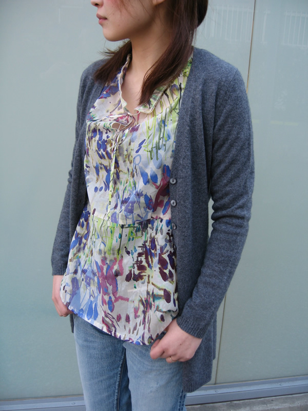 なんだか着ているだけで、春気分になれそうです。絵画タッチな絵柄が甘すぎず、コーディネートのポイントとして活躍します。