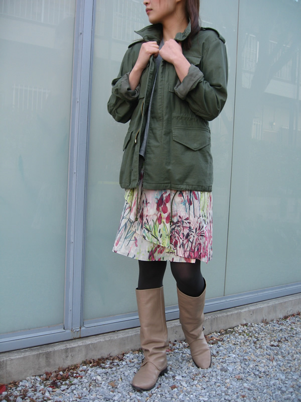 同シリーズのスカート。あんまり広がり過ぎず、きれいなシルエットのスカートですので、ジャケットと合わせてもすっきりします。でも、あえてミリタリーのジャケットと合わせて、着崩すのもおしゃれですね。