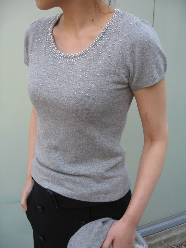 レースとビーズの刺繍がとても繊細で女性らしいニット。同シリーズで半袖ニットもありますのでツインで着ていただくこともできます。カシミヤ&アンゴラ混なので、柔らかく暖かく、ちょっとしたパーティーにも対応できます。
