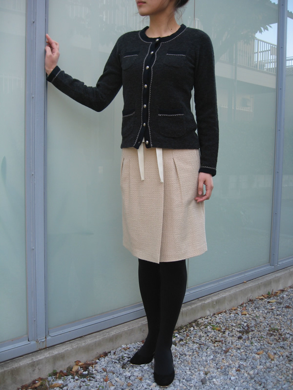 ショールカラーのニットカーディガン。直線的なラインがとてもきれいなデザインで、ショート丈ですので、スカートやワンピースに好相性です。