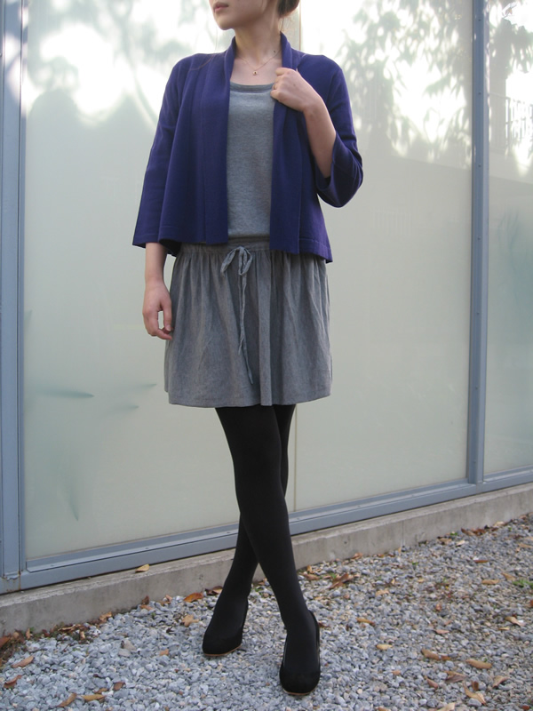 ・タートル ¥16800 (シルク×カシミヤ) カラー: パープル系 グレー系(上の写真のカーディガンのインナーで着用しています。)